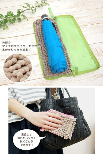 内側の片面に傘の水分を吸ってくれるマイクロファイバーモップが 付いています。